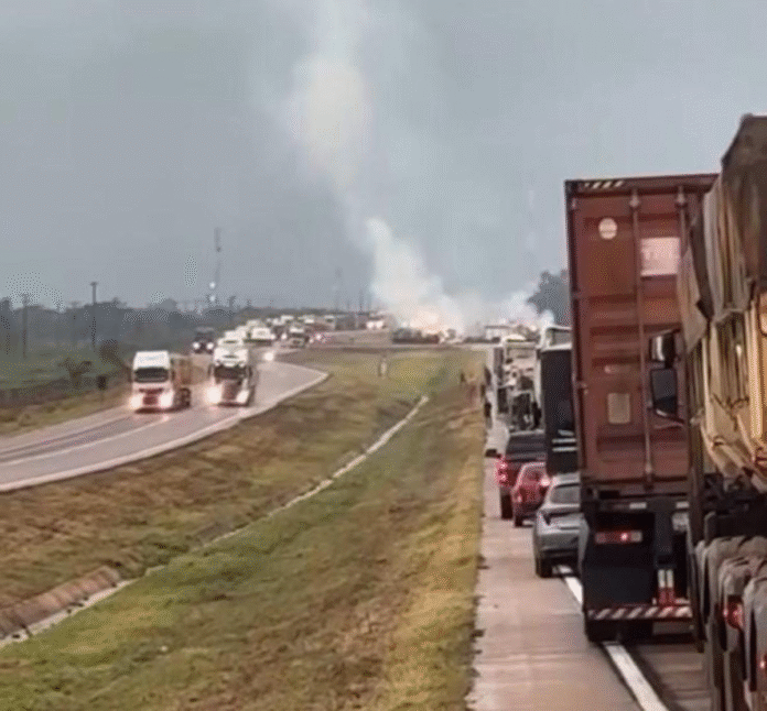 Inicialmente, o trânsito foi desviado para o acostamento, até ser totalmente bloqueado após as plumas de algodão começarem a pegar fogo.