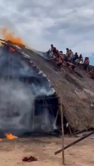 Imagens gravadas pelos próprios moradores mostram os indígenas combatendo as chamas que tomaram conta de uma casa, no domingo (26), na aldeia Dolowikwa/Kotakwinakwa, na Terra Indígena Enawenê Nawê, em Juína, a 737 km de Cuiabá (assista abaixo).