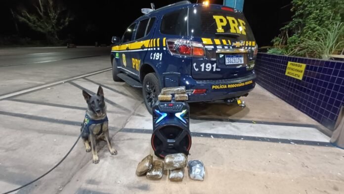 Uma mulher foi presa após cães farejadores da Polícia Rodoviária Federal (PRF) encontrarem oito tabletes de substância análoga à maconha escondidos dentro de uma caixa de som. A apreensão ocorreu durante fiscalização de um ônibus interestadual em Santo Antônio do Leverger, a 35 km de Cuiabá, nesta segunda (3).