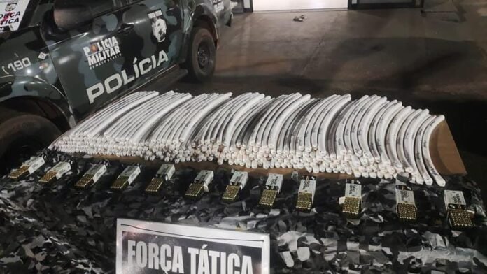 Policiais militares da Força Tática do 12º Comando Regional apreenderam 284 emulsões explosivas (explosivos de alta performance utilizados em mineração), 600 munições calibre 9 milímetros e porções de substância análogas à maconha, durante abordagem, nesta quarta-feira (5), no município de Pontes e Lacerda (445 km de Cuiabá).