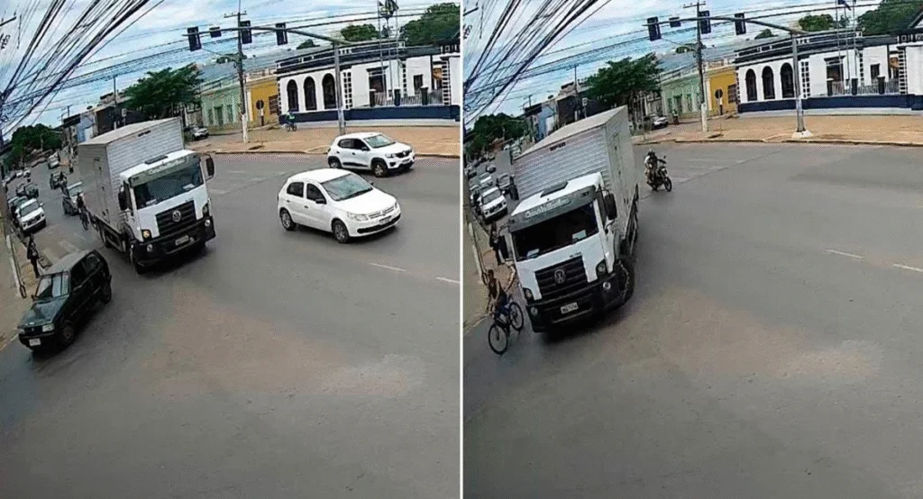 Imagens de câmeras de segurança mostram o momento em que o venezuelano faz a curva ao lado de um caminhão, quando o veículo avança pela rua e o acerta. O acidente ocorreu próximo da igreja São Gonçalo.