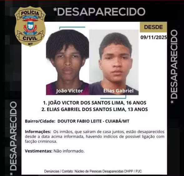 Os adolescentes estavam desaparecidos desde 9 de novembro, em Cuiabá. Segundo a Polícia Civil, os irmãos saíram de casa para comprar chinelos e não voltaram. As investigações indicam que eles faziam parte de uma facção criminosa.