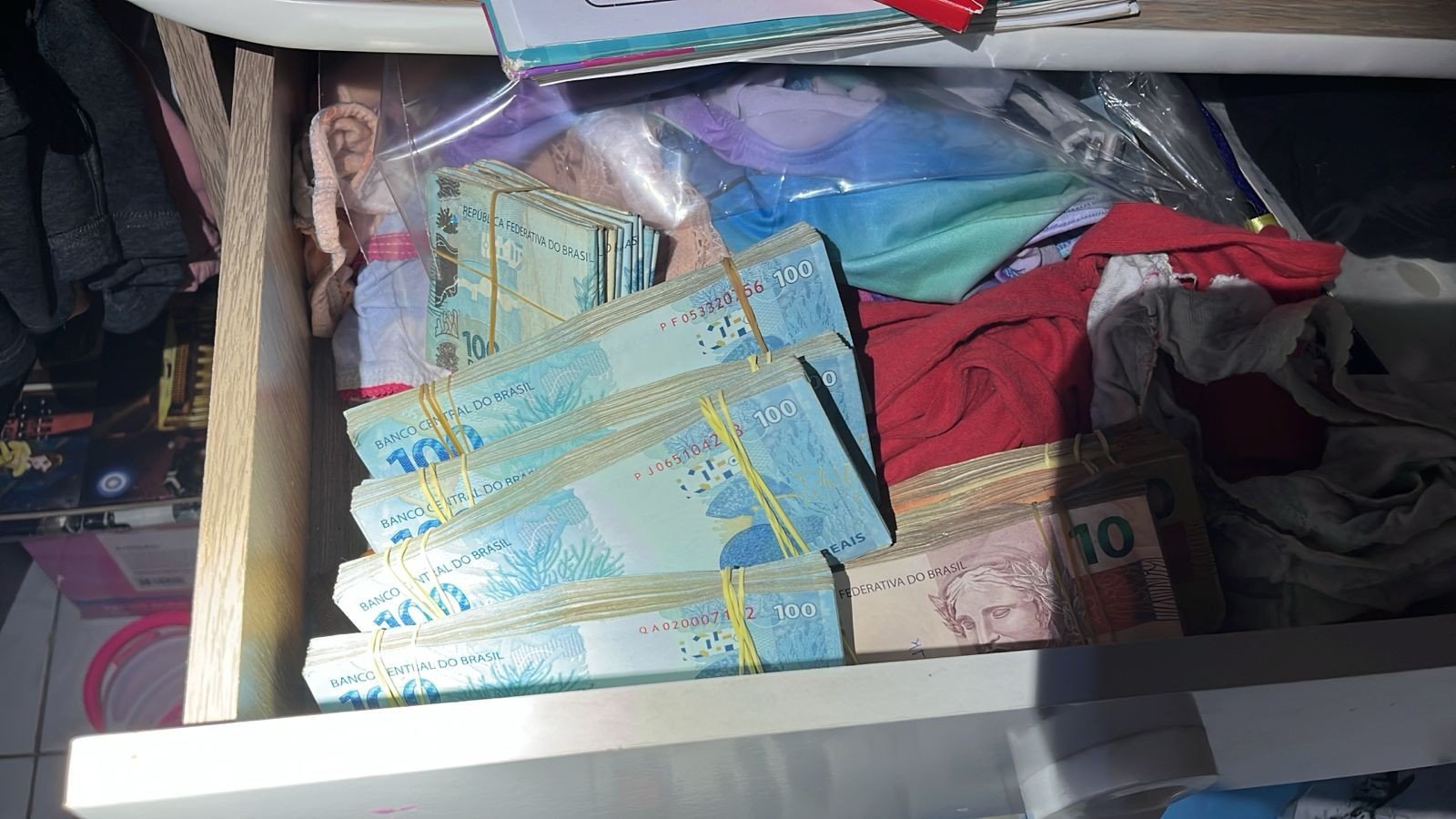 Durante o cumprimento dos mandados, uma pessoa foi presa em flagrante pelo crime de posse ilegal de arma de fogo de uso restrito. Os policiais também apreenderam uma quantia significativa de dinheiro.
