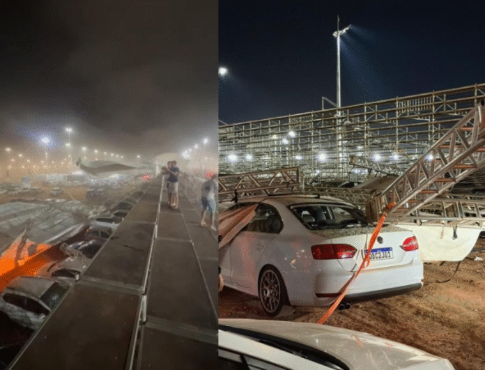 Uma forte ventania derrubou parte da cobertura de uma arquibancada e deixou três pessoas feridas no Autódromo Internacional do Estado de Mato Grosso, no Parque Novo Mato Grosso, em Cuiabá, nessa quinta-feira (14). O incidente ocorreu durante um treino das equipes da Stock Car.
