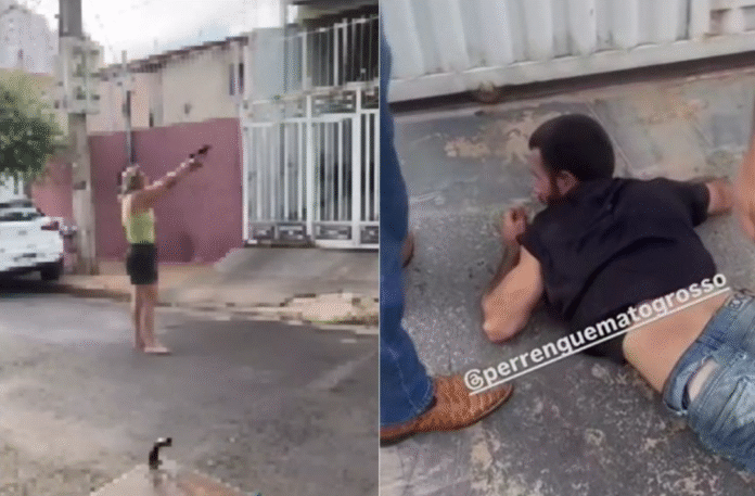 Nas imagens, a mulher, de 49 anos, grita para que o suspeito desça, chegando a disparar um tiro para o alto para intimidá-lo. Em seguida, o homem acaba descendo e é imobilizado por moradores na calçada, onde aguarda a chegada da Polícia Militar.