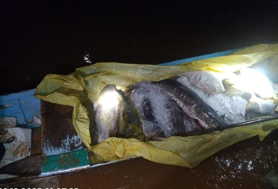 Além do material, as equipes flagraram 26 unidades de pescado irregular, entre as espécies, pintado, cachara, jaú e pacu, pesando 182,5 quilos, que estavam armazenados sob gelos, por cima de uma lona. O suspeito e os materiais recolhidos foram entregues à delegacia para registro do boletim de ocorrência.