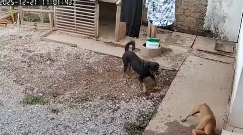 Câmera de segurança registrou o momento em que a vítima já aparece caída no quintal. Em seguida, é atacada pelo cachorro. A perícia aponta ainda que ela já estava sem defesa e que, provavelmente, estava desacordada no momento do ataque.