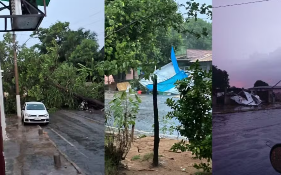 Uma tempestade atingiu Santo Antônio de Leverger, a 30 km de Cuiabá, neste domingo (28), e deixou diversas casas destelhadas, além de derrubar árvores e portões. Vídeos feitos por moradores mostram os estragos (assista abaixo).