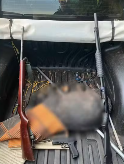 Durante a revista no veículo, a equipe encontrou três armas de fogo, todas estavam em condições de uso. Na caçamba do carro, os policiais localizaram um porco-do-mato com ferimentos compatíveis com disparo de arma de fogo, o que indicou a prática de caça ilegal.