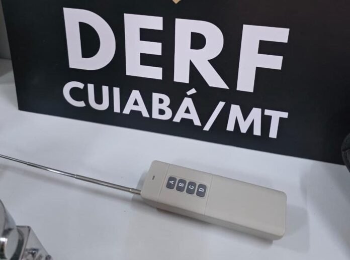 Durante a revista pessoal, foi localizado com ele um aparelho eletrônico utilizado para bloqueio de sinais de travamento de veículos, conhecido como “Chapolin”, equipamento comumente empregado em crimes de furto mediante arrombamento.