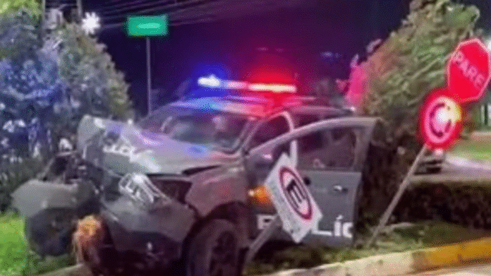 O carro que bateu na viatura rodou no local com a força do impacto e o motorista, sem CNH, estava acompanhado de uma garota.