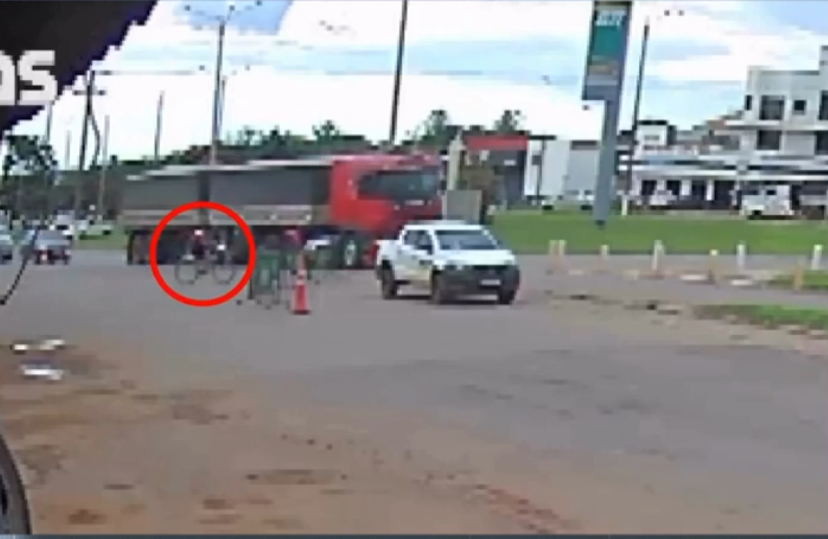 Uma câmera de monitoramento registrou o momento em que a ciclista Maria Aparecida Gomes, de 56 anos, é atropelada por uma carreta, durante uma conversão na BR-070, em Campo Verde (MT), nessa segunda-feira (5). A vítima foi conduzida para o hospital, mas morreu na unidade (Veja vídeo Abaixo).
