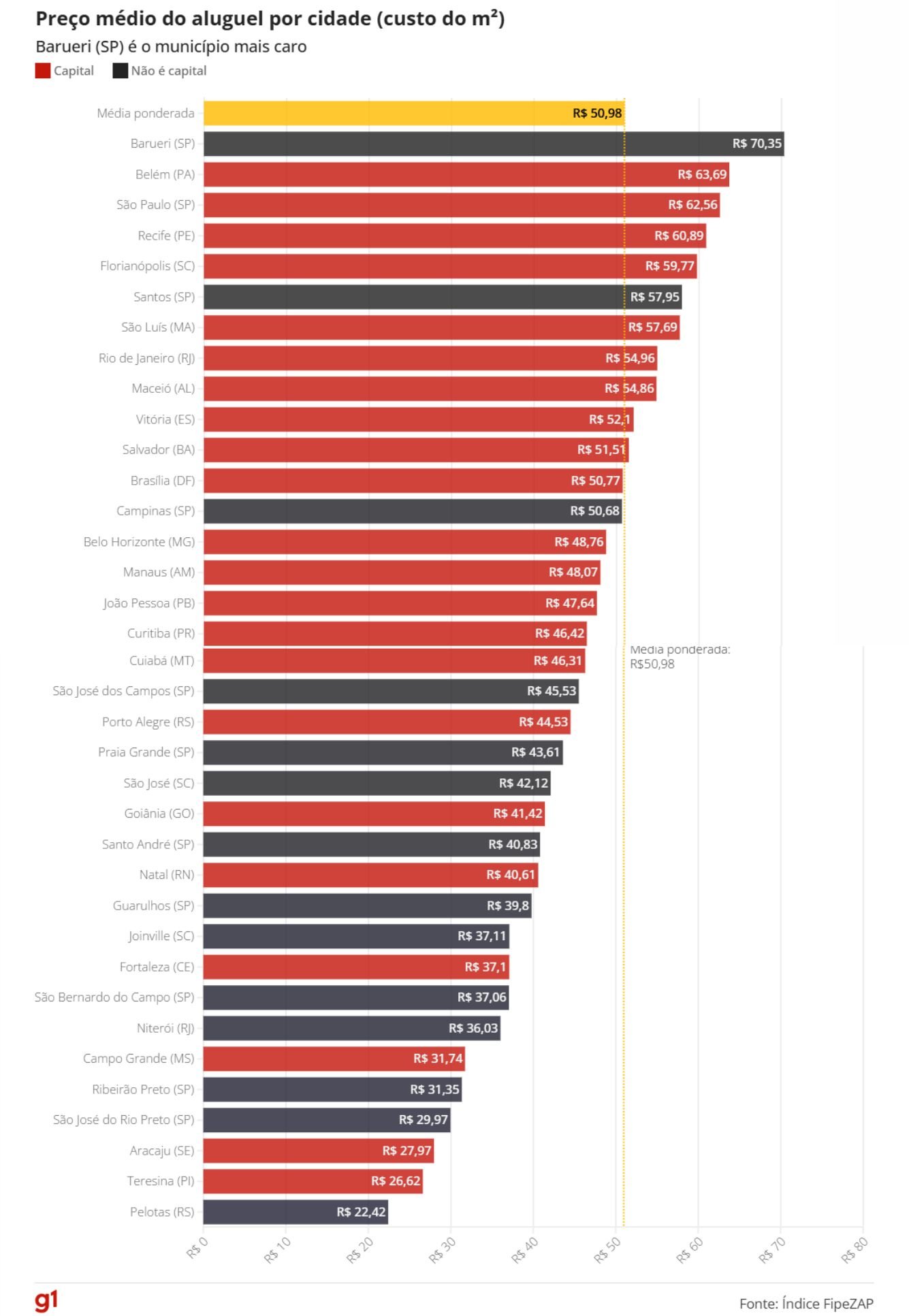 A cidade mais cara do país para se viver de aluguel é Barueri, onde o custo médio mensal chega a R$ 70,35 por m². A cidade ocupa o topo do ranking desde 2022.
