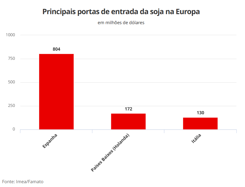 A União Europeia compra US$ 1,26 bilhão em soja e US$ 446 milhões em milho. A Espanha é o maior cliente, como processadora de ração. Isso coloca a UE como segunda maior compradora de soja de Mato Grosso, ficando atrás apenas da China (veja mais detalhes abaixo).