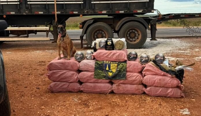 Diante da suspeita, os cães farejadores foram empregados e indicaram, de imediato, a presença de odor característico de substância entorpecente. Em seguida, foi realizada uma vistoria minuciosa na carga e, ao levantar a lona da carreta, os policiais localizaram fardos com características típicas de entorpecentes, misturados ao material transportado, além de embalagens incompatíveis com o produto declarado.