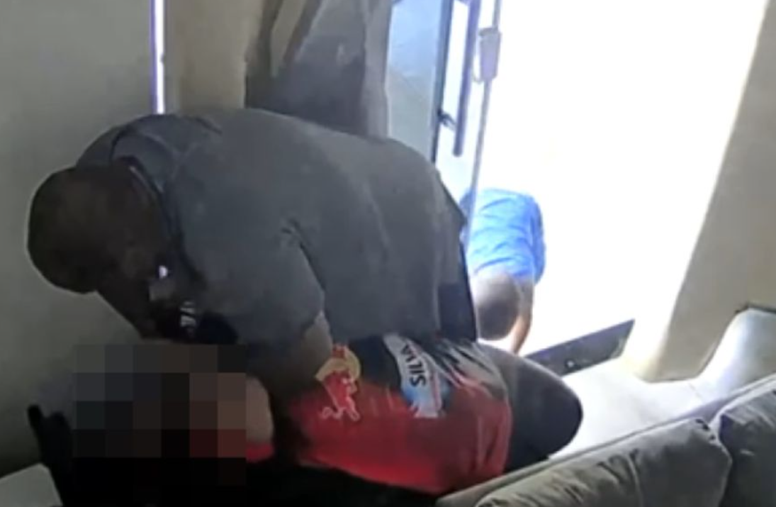 Já no interior do imóvel, o homem a derruba no chão e passa a enforcá-la. A criança tenta intervir na situação, jogando-se contra os pais e chorando.
