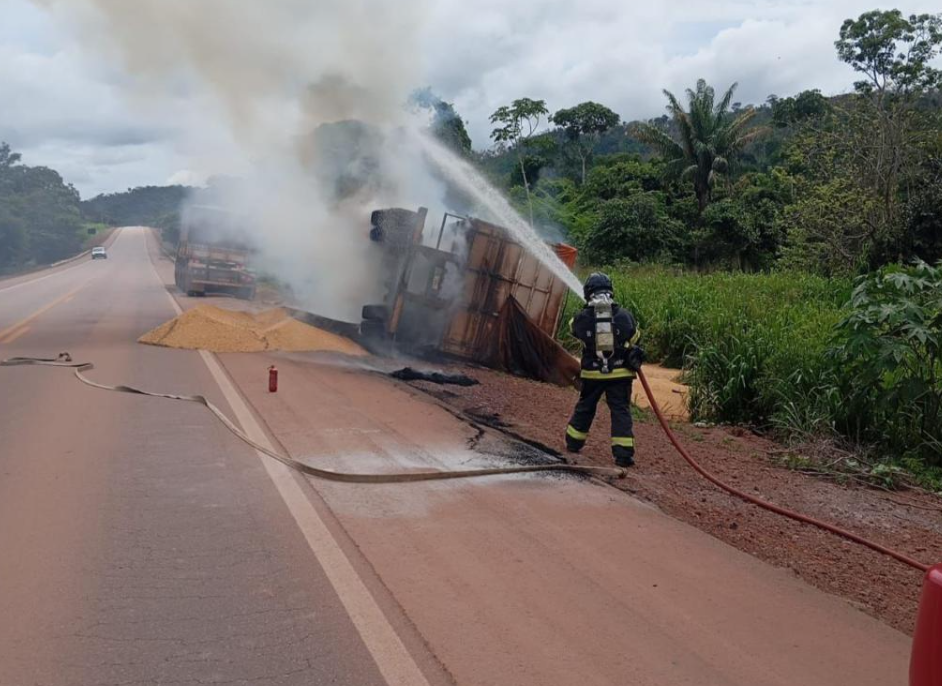 O Corpo de Bombeiros Militar de Mato Grosso (CBMMT) foi acionado na manhã deste domingo (25.1) para atender uma ocorrência de incêndio em uma carreta que transportava soja na BR-163 em Guarantã do Norte (709 km de Cuiabá).