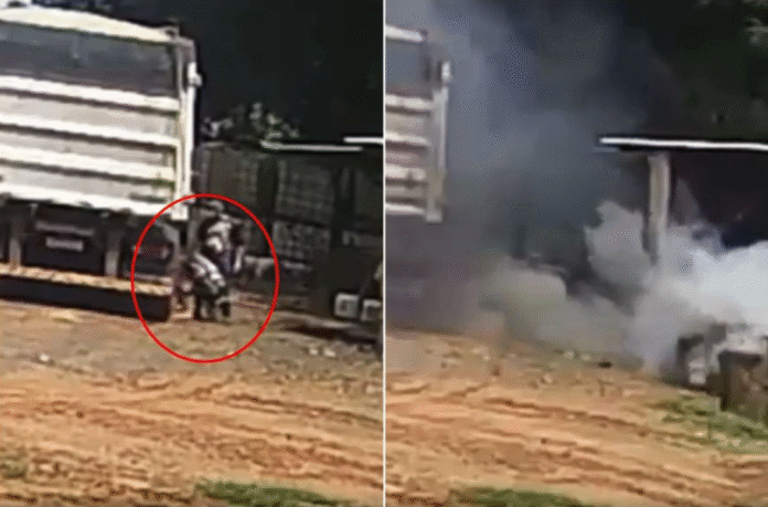 Um vídeo mostra o momento que o pneu de um caminhão estoura durante a manutenção do veículo e mata o trabalhador Alcir Joelson Wandscheer, de 43 anos em uma fazenda de Sorriso, a 420 km de Cuiabá, nesta segunda-feira (26).