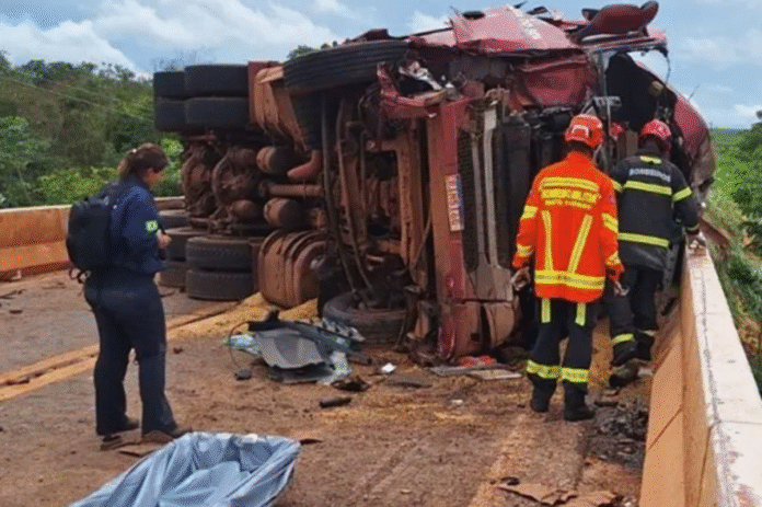 A colisão ocorreu por volta das 11h50 na ponte sobre o Rio Sete de Setembro. O motorista que morreu ficou preso às ferragens após o impacto.