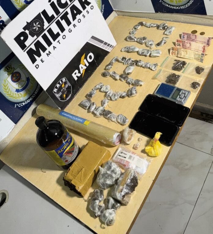 Dois homens, de 18 e 21 anos, foram presos, na noite desta quinta-feira (12), por policiais militares da 24ª Companhia Independente de Motopatrulhamento Tático (Raio), suspeitos por tráfico de drogas, em Cuiabá. Os militares recolheram 57 porções de entorpecentes, entre maconha e pasta base de cocaína, além de materiais para embalagem e preparo dos ilícitos.