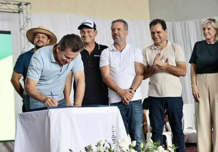 Durante o evento, o governador Mauro Mendes assinou ordem de serviço para asfalto novo em ruas e avenidas de Salto do Céu, no valor de R$ 1,5 milhão, ampliando a infraestrutura urbana da cidade.