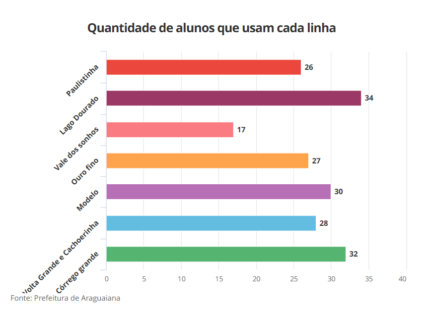 O transporte escolar é organizado em sete linhas distintas, responsáveis pelo trajeto de ida e volta dos estudantes para cada uma das escolas do município.