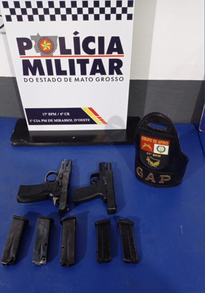 Policiais militares da 1ª Companhia da Polícia Militar prenderam, na noite desta sexta-feira (20), uma mulher de 33 anos por porte irregular de arma de fogo, em Mirassol D’Oeste. Na residência da suspeita, os militares apreenderam duas pistolas calibre 9mm e cinco carregadores de munição.