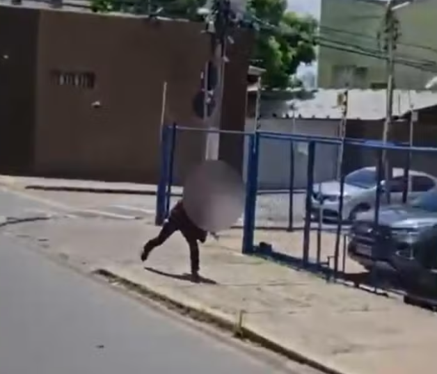 Já do lado de fora, ele arremessa duas pedras, momento em que o motorista sai do veículo para questioná-lo. O passageiro cruza a rua e, do outro lado, arremessa a terceira pedra. Para evitar mais confusão, o motorista decide seguir viagem.