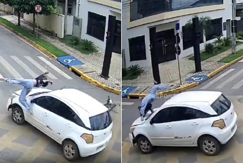 As imagens mostram o momento em que o carro cruza a rua e bate contra a motociclista, que voa por cima do parabrisa e cai próxima ao meio-fio.