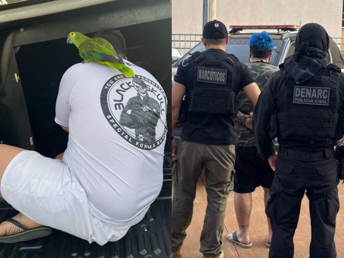 O papagaio de um dos alvos da Operação Contenção deflagrada nesta quarta-feira (18) acompanhou o tutor até a viatura da polícia em Cuiabá, que é suspeito de integrar um esquema especializado em tráfico interestadual de drogas.