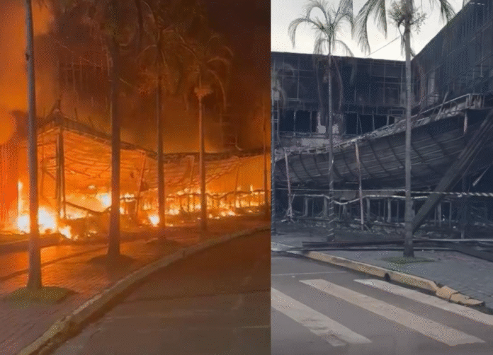 Vídeos registrados por câmeras de segurança e por pessoas que passavam pelo local mostram a estrutura sendo consumida pelo fogo.