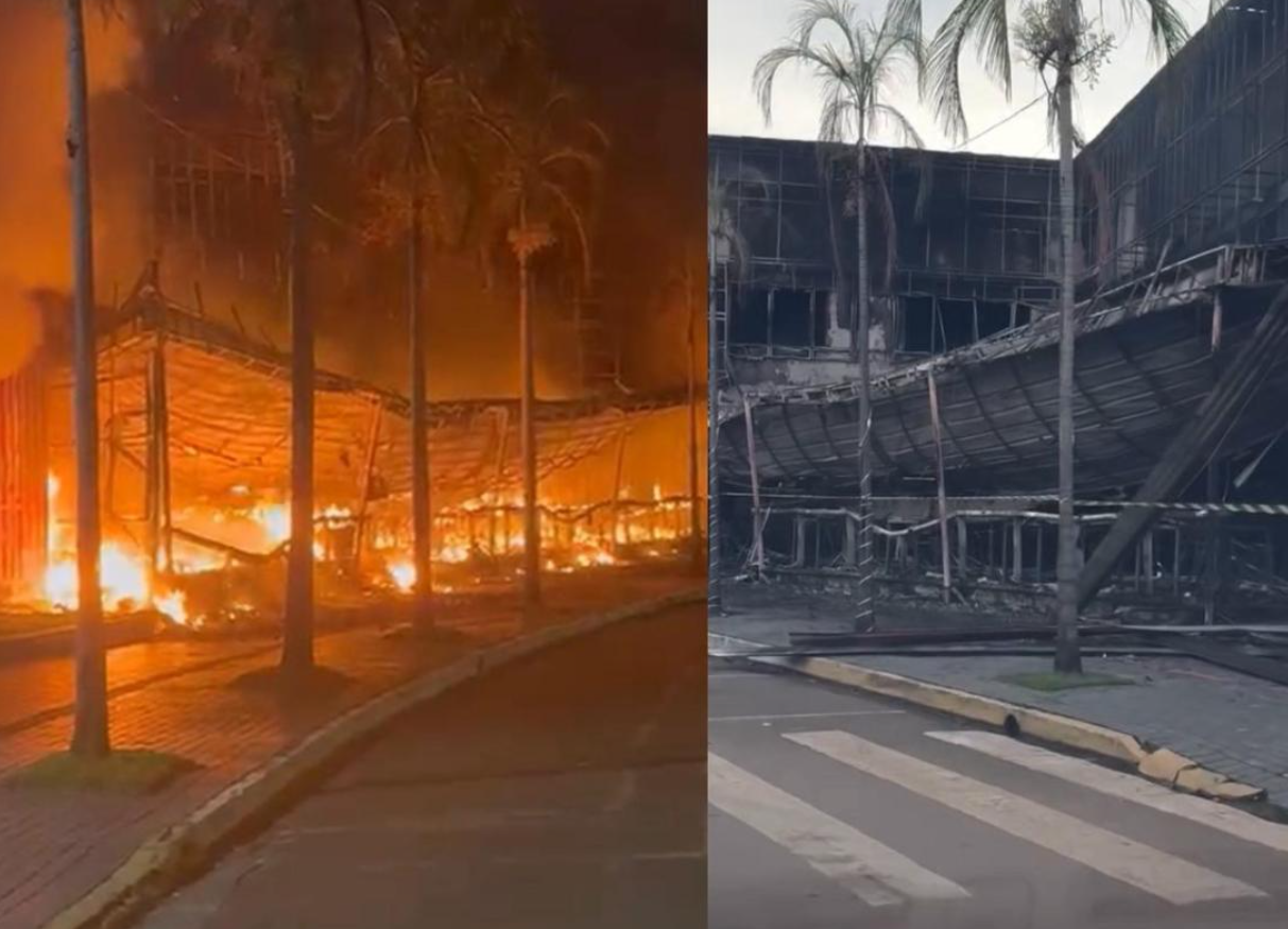 Vídeos registrados por câmeras de segurança e por pessoas que passavam pelo local mostram a estrutura sendo consumida pelo fogo.