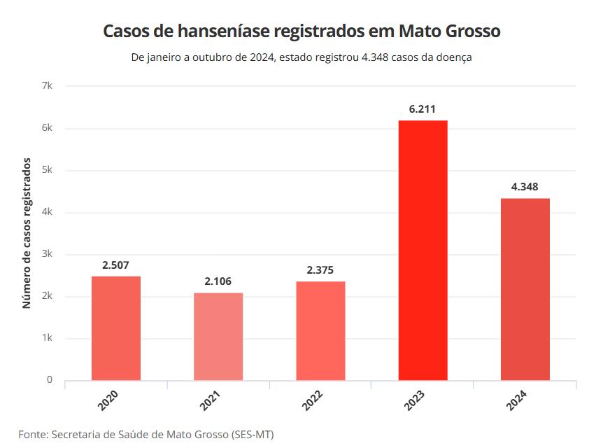 O estado registrou 4.348 casos de hanseníase, de janeiro a outubro de 2024, de acordo com dados da Secretaria Estadual de Saúde (SES-MT). Em 2023, o estado liderou o ranking com a maior taxa de detecção da hanseníase no país, com 6.211 casos da doença.