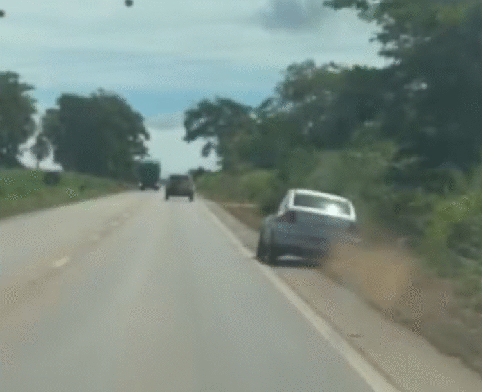 Ocupantes do veículo que estava atrás registraram o momento em que o carro oscila entre as faixas da pista por alguns segundos e depois capota.