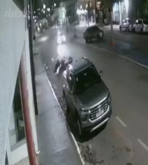 Imagens de uma câmera de segurança registraram o momento em que o motociclista perde o controle da moto e fica preso embaixo de um carro estacionado.