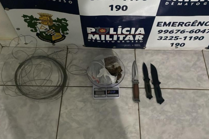 Durante buscas no imóvel, os policiais apreenderam facas, arames utilizados para amarrar as vítimas e cerca de meio quilo de substância análoga à maconha.
