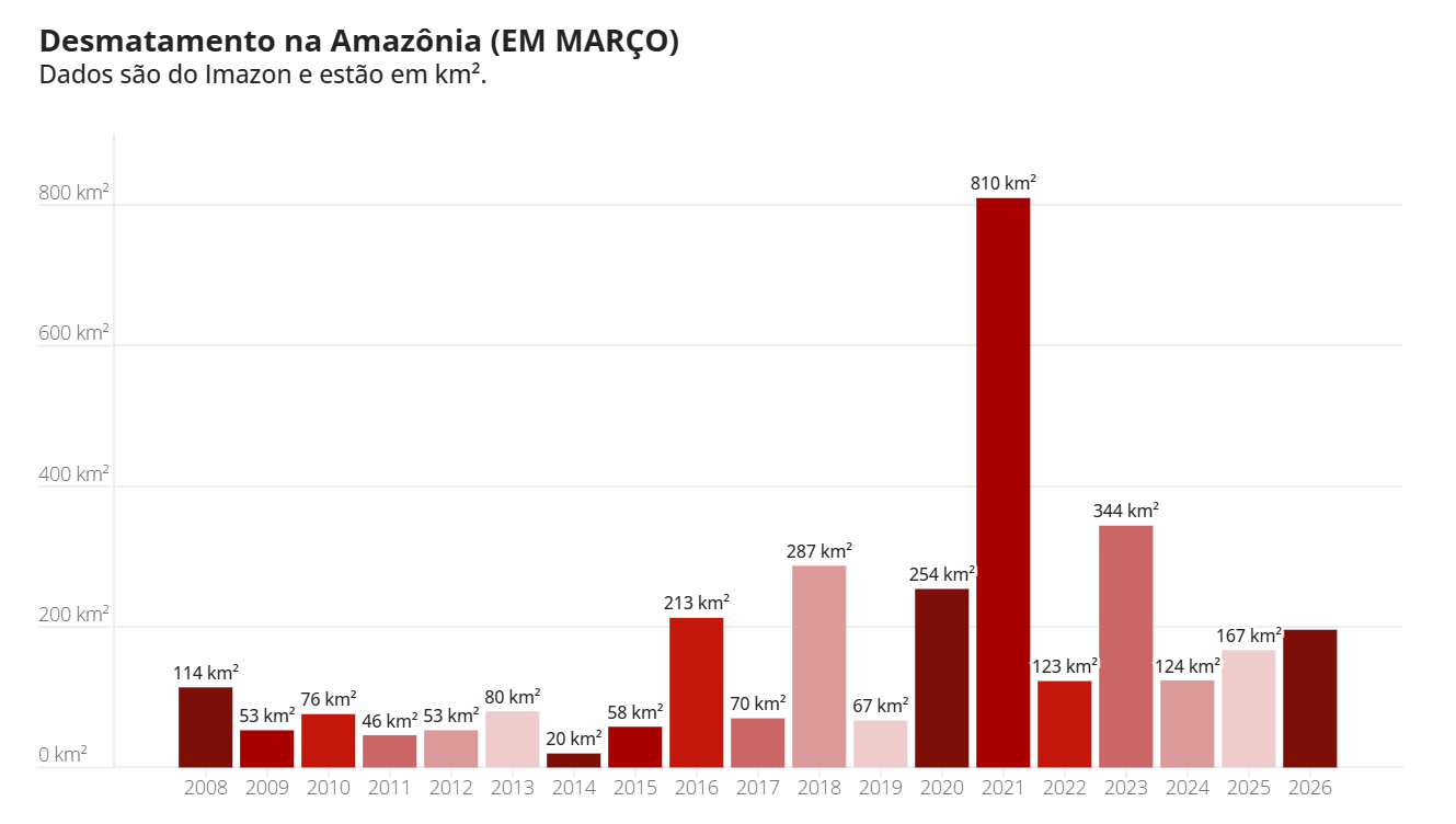 No mês passado, o desmatamento chegou a 196 km², alta de 17% em relação aos 167 km² registrados em março de 2025.