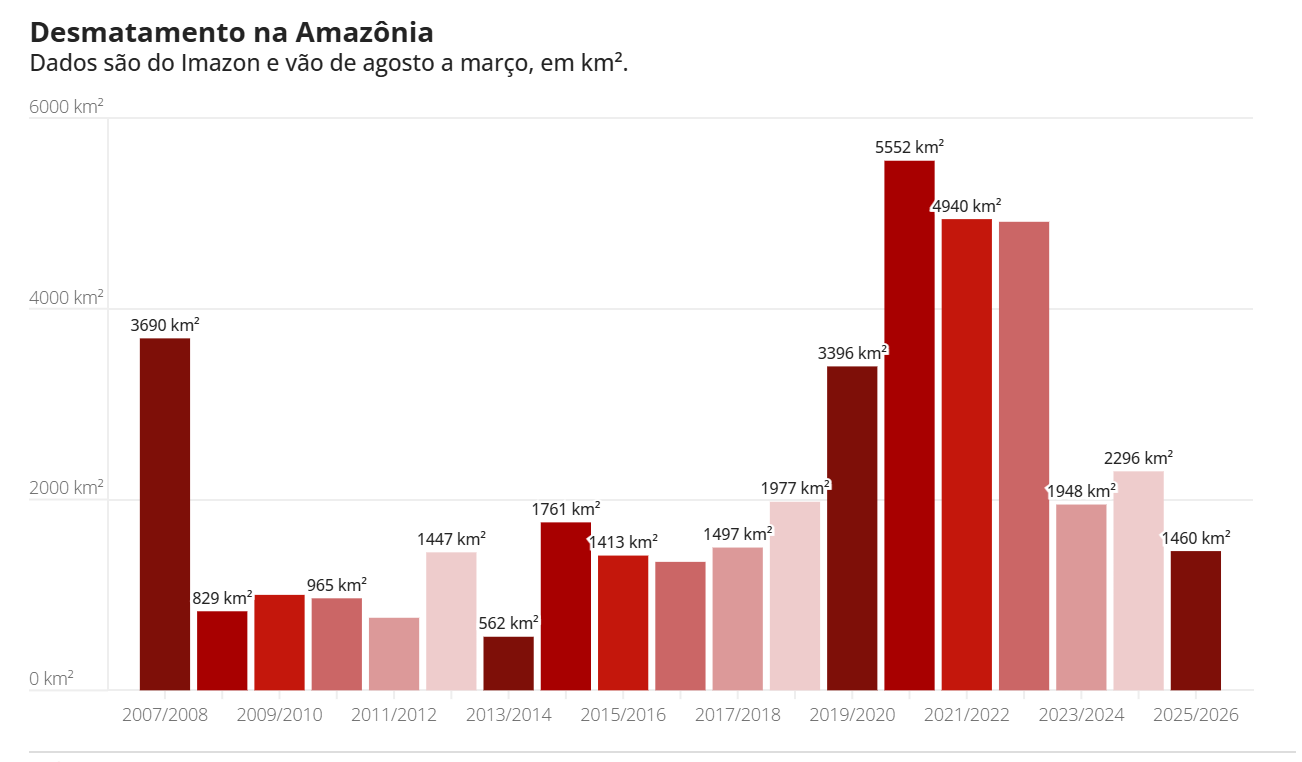 Entre agosto de 2025 e março de 2026, a área desmatada passou de 2.296 km² para 1.460 km², uma redução de 36%.