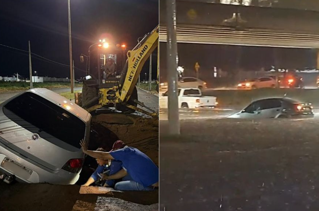 Em Primavera do Leste, a situação foi ainda mais crítica. No bairro Poncho Verde, um carro caiu em um buraco encoberto pela água. Apesar do impacto, ninguém ficou ferido.