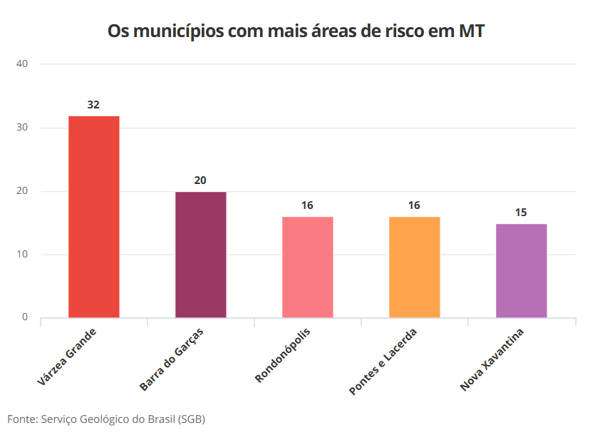 Os municípios com mais áreas de risco são Várzea Grande, Barra do Garças e Rondonópolis (veja gráfico abaixo). O monitoramento faz parte do planejamento anual do SGB e está previsto no Plano Plurianual 2024-2027 do governo federal.