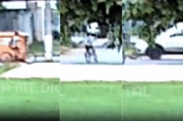 Uma câmera de segurança registrou o momento em que um menino de 7 anos foi atropelado ao tentar atravessar a rua de bicicleta, no início da tarde desta segunda-feira (27), em Lucas do Rio Verde (333 km de Cuiabá).