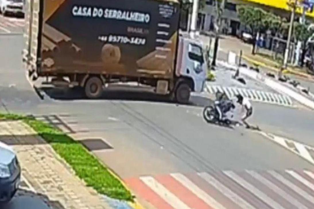 Imagens de uma câmera de segurança registraram o momento em que a vítima acessa a rotatória por volta das 14h. Na sequência, o caminhão avança sem respeitar a preferência e atinge a motociclista, que é arremessada com o impacto.